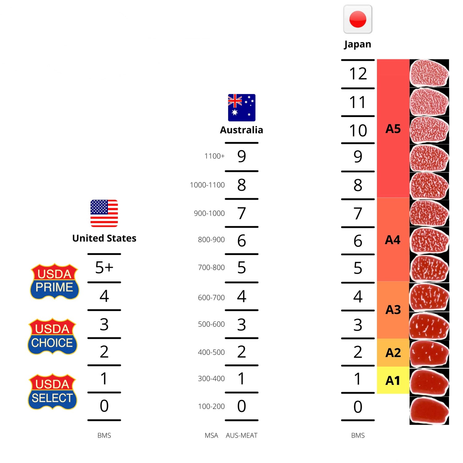 BMS stands for Beef Marbling Standard, which is a standard for evaluating “fat crossing”. The rank of beef is determined by the quality and quantity of the marbling in the lean meat. There are 1 to 12 ranks, with 12 being the best.