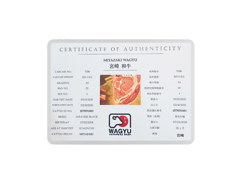 All A5 Wagyu beef from Wagyu House Shop comes with a Certificate of Authenticity. A Traceable Cattle-ID number on the certificate is the only way to certify genuine Japanese wagyu beef. Check the record of cattle on the Official Japanese Website.